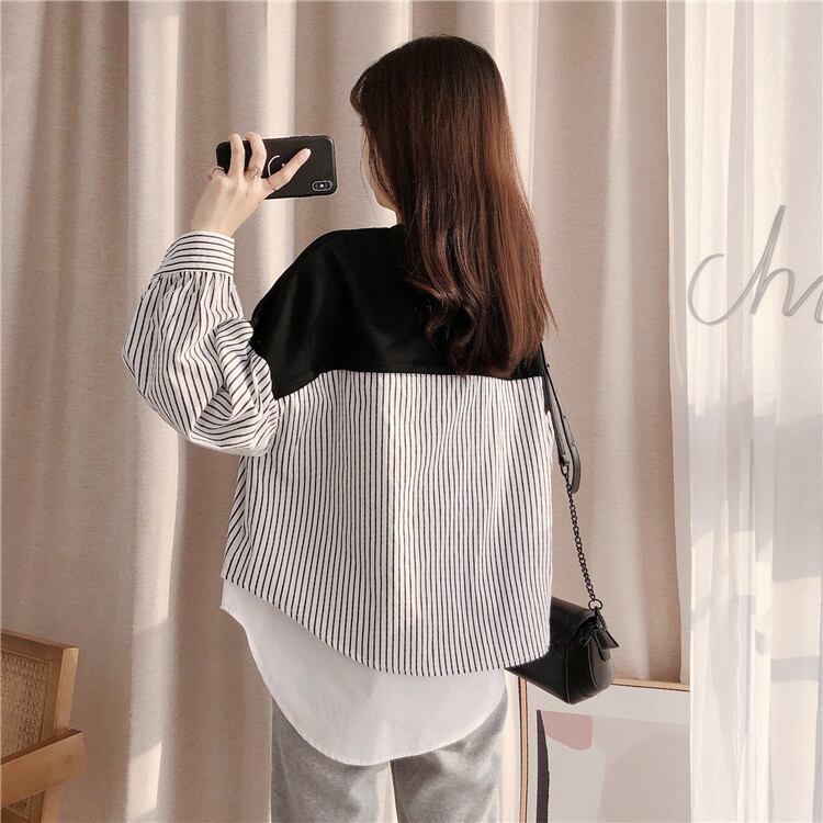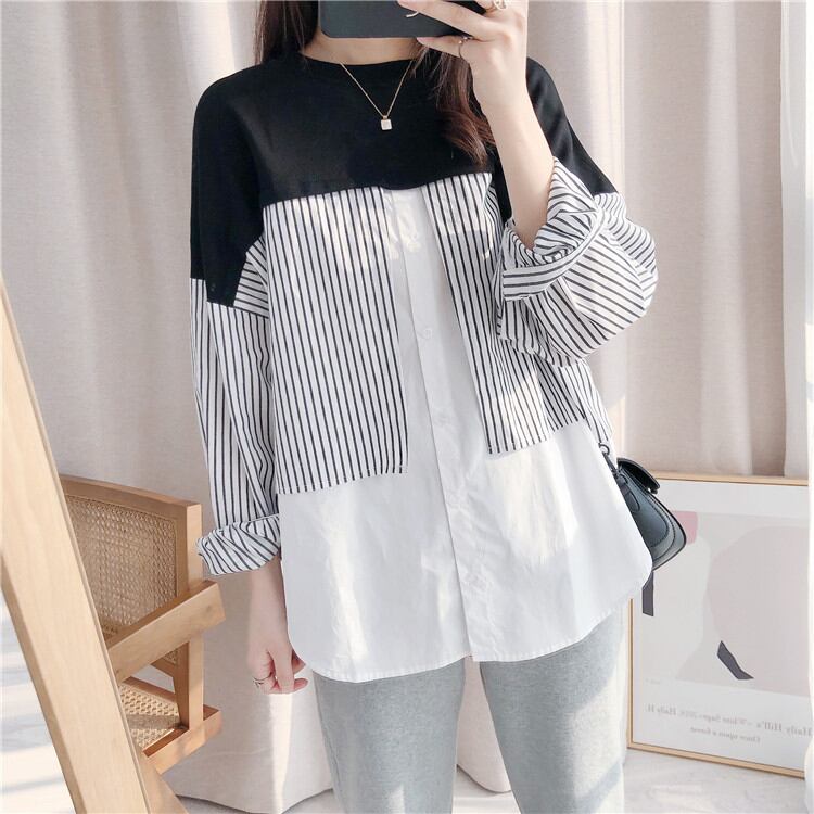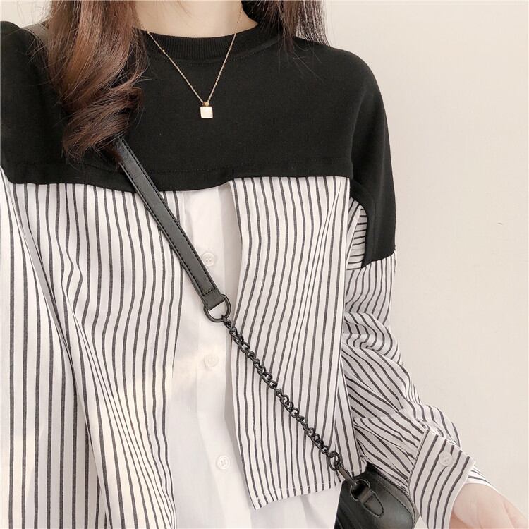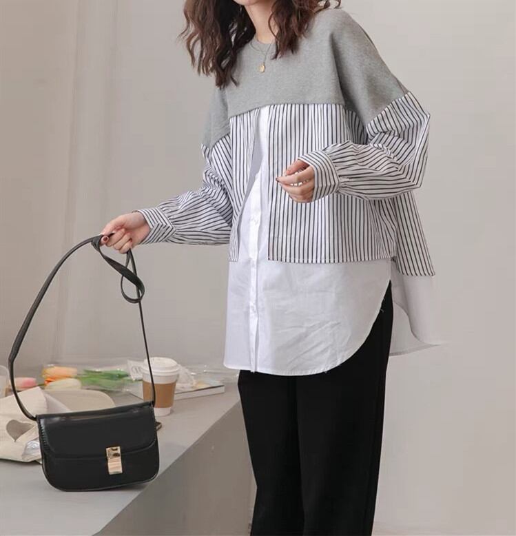 2021秋新作 異素材MIX ブラウス プルオーバー 重ね着風 長袖 レディース 韓国ファッション