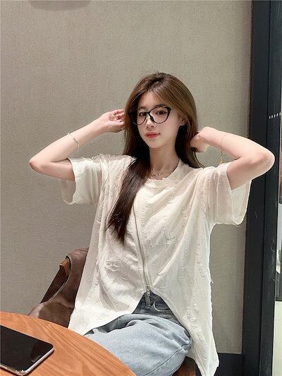 2024春夏トップス Tシャツ 半袖 ラウンドネック 丈長め 斜めチャック ジップ ゆったり 細見え 夏 白 黒 おしゃれ かわいい カジュアル 韓国ファッション レディース お出かけ