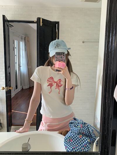2024 春夏 甘い トップス Tシャツ ラウンドネック 2色展開ショート丈 休日 ファッション スリムフィット丈短め ショート へそ出し 休日 おしゃれ T