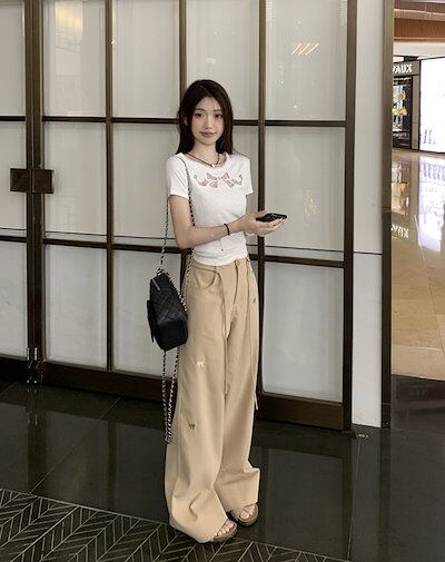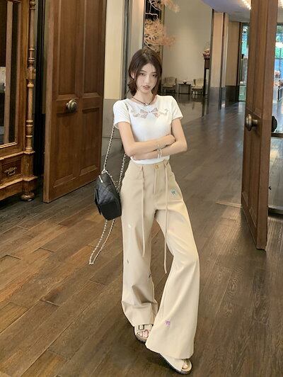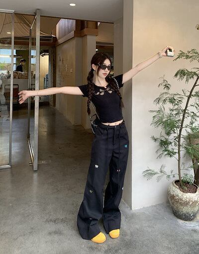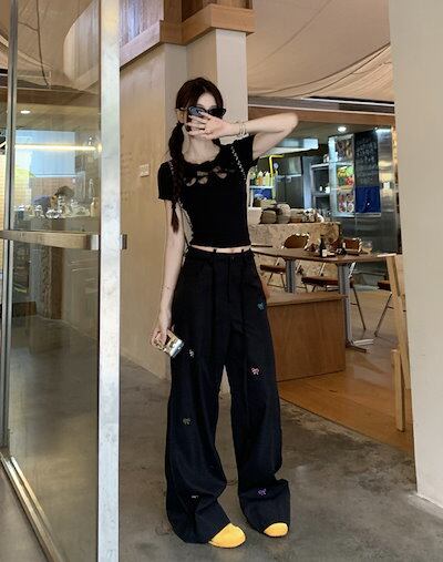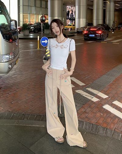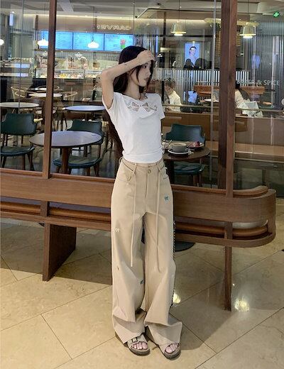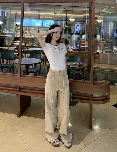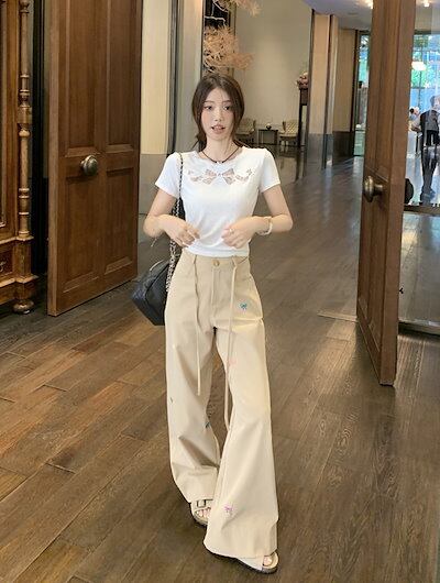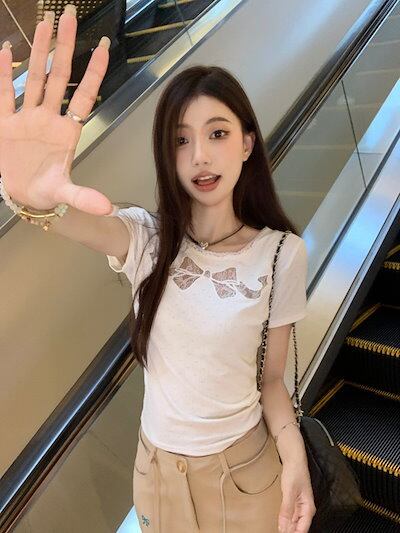 2024 春夏 甘い トップス Tシャツ ラウンドネック韓国 2色展開丈 休日 ファッション レディース スリムフィット丈短め ショート へそ出し 休日 おしゃれ T