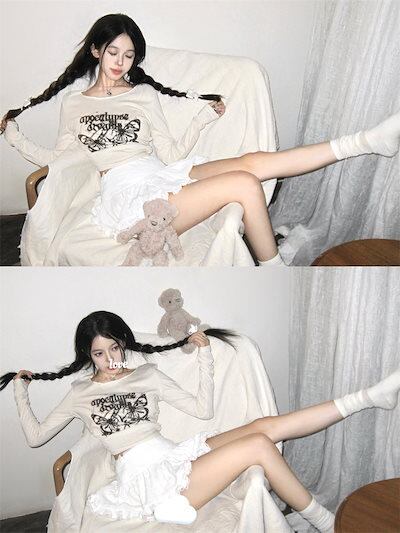 2024春夏 甘く tシャツ かわいい 長袖 トップス レイヤード風 重ね着風 カットソー インナー ショート タイト フィット T カジュアル きれいめフェミニンフレンチモックネックファッション