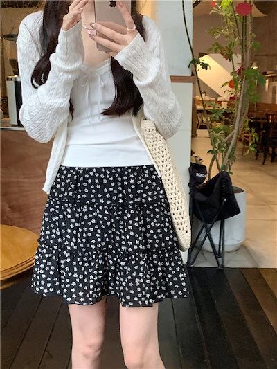 2024春夏スカート ミニ丈 ハイウエスト 脚長効果 美脚効果 細見え 小花 かわいい おしゃれ キュート フレンチ 甘め カジュアル 春 黒 白 韓国ファッション レディース お出かけ