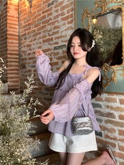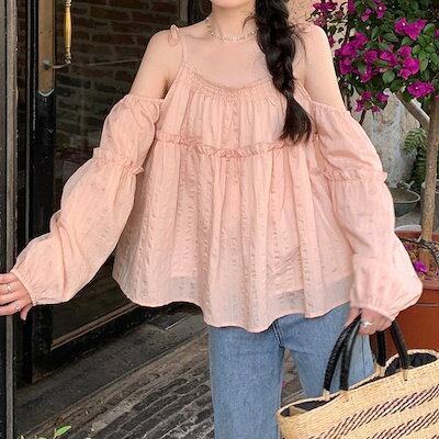 2024春夏トップス シャツ オープンショルダー キャミソール 肩見せ 長袖 フレア 細見え 春 紫 韓国ファッション レディース おしゃれ かわいい キュート 甘め ガーリー カジュアル お出かけ