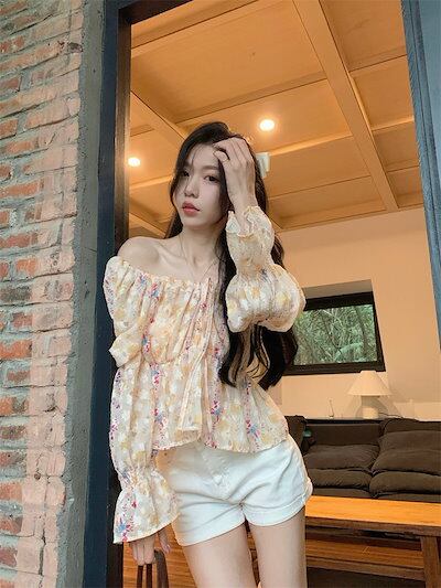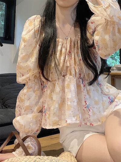 2024春夏トップス シャツ ブラウス 花柄 長袖 バブル袖 ポエットスリーブ キャンディスリーブ オフショルダー 丈短め 春 ゆったり かわいい ガーリー 甘め おしゃれ 韓国ファッション レディー