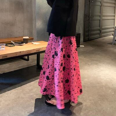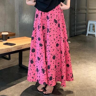 2024 春夏スカート Aライン ロング丈 ハイウエスト 美脚効果 脚長効果 細見え ピンク ビビットカラー 花柄 夏 韓国ファッション レディース おしゃれ 甘辛 カジュアル お出かけ