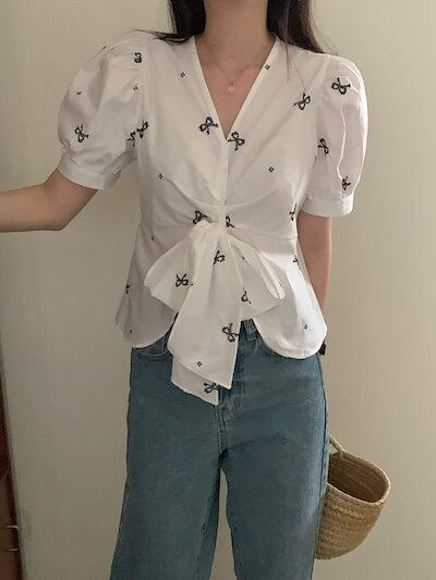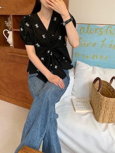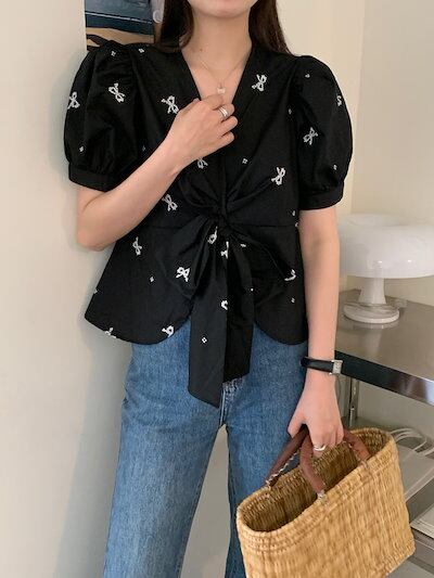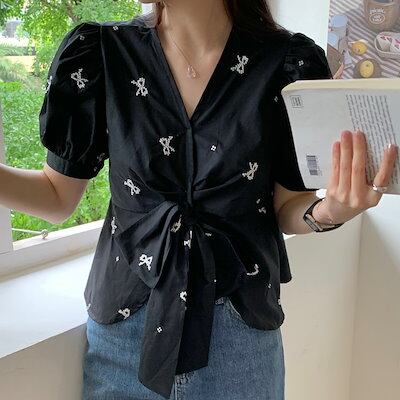 2024春夏トップス シャツ 半袖 細見え 夏 黒 白 かわいい キュートネック おしゃれ 韓国ファッション レディース
