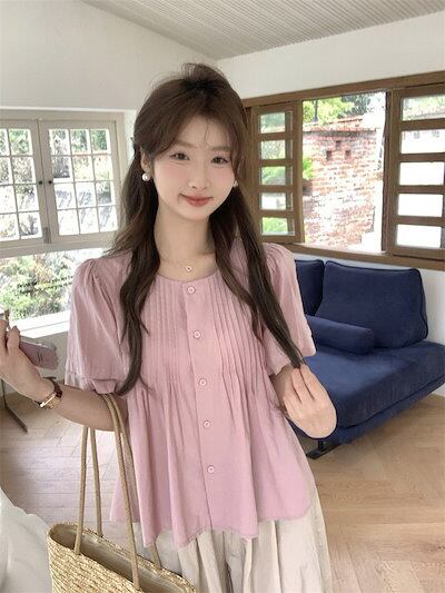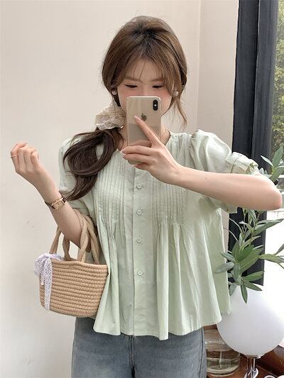 2024春夏トップス シャツ ブラウス 半袖 バブル袖 夏 白 緑 ゆったり かわいい ガーリー 甘め おしゃれ 韓国ファッション レディース お出かけ