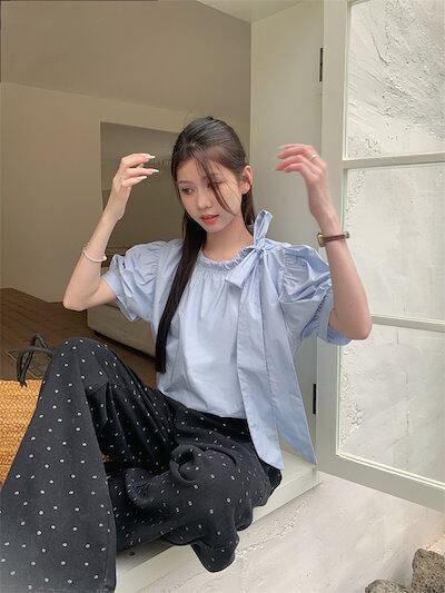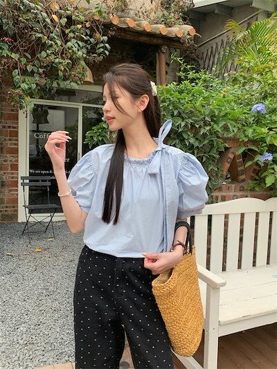 2024春夏トップス シャツ ブラウス 半袖 ゆったり 夏 青 かわいい 甘め おしゃれ きれいめ 韓国ファッション レディース お出かけ