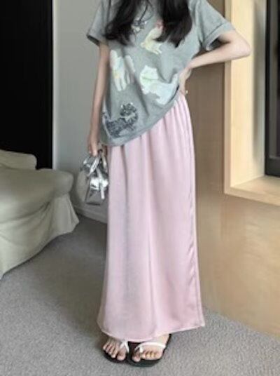 2024 春夏スカート ロング丈 Aライン サテン フレア ウエストゴム ハイウエスト 美脚効果 脚長効果 細見え 夏 白 黒 黄緑 韓国ファッション レディース かわいい おしゃれ カジュアル お出