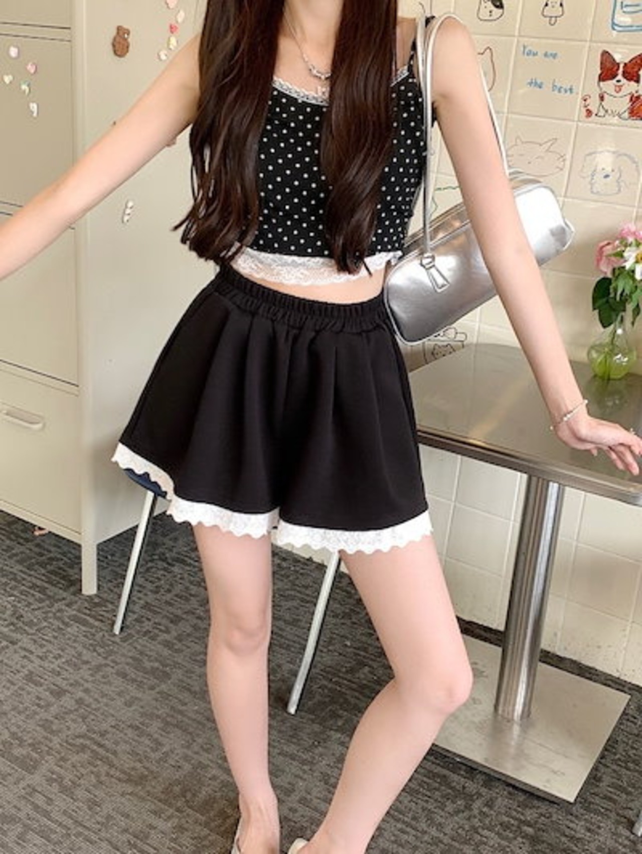 2024 春夏パンツ ショート丈 レース ウエストゴム ハイウエスト 脚長効果 美脚効果 細見え ゆったり 夏 黒 かわいい カジュアル 韓国ファッション レディース お出かけ