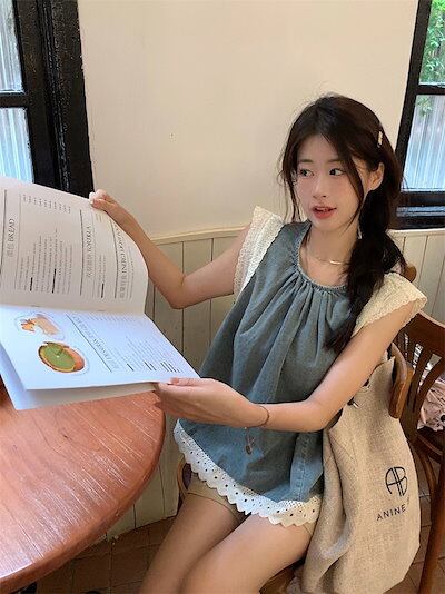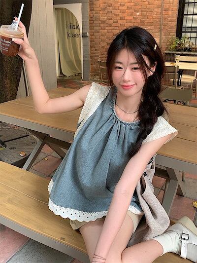 2024春夏トップス デニム生地 シャツ タンクトップ ラウンドネック レース ゆったり 夏 かわいい ガーリー おしゃれ 韓国ファッション レディース お出かけ