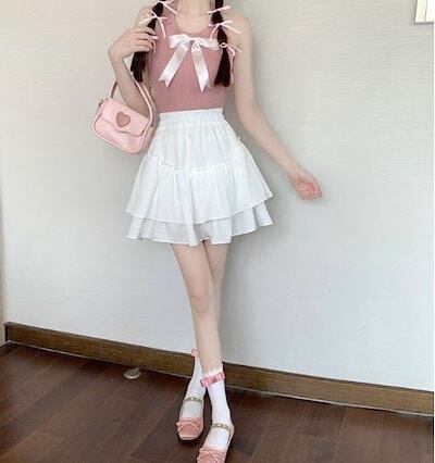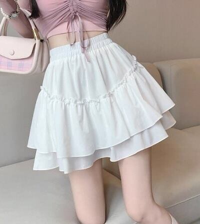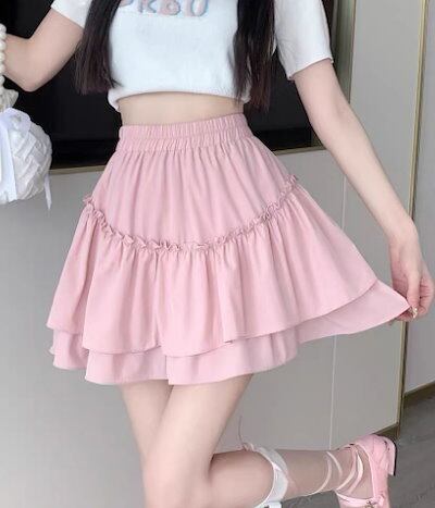 2024春夏フリルでアイドル風コーデハイウエストフリルフレアスカート 脚長効果vミニスカート 韓国ファッション 韓国ガーリー ミニスカート