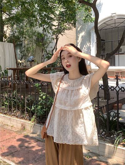 2024春夏トップス シャツ 半袖 ラウンドネック レース ゆったり フリル 夏 白 茶色 かわいい ガーリー おしゃれ 韓国ファッション レディース お出かけ