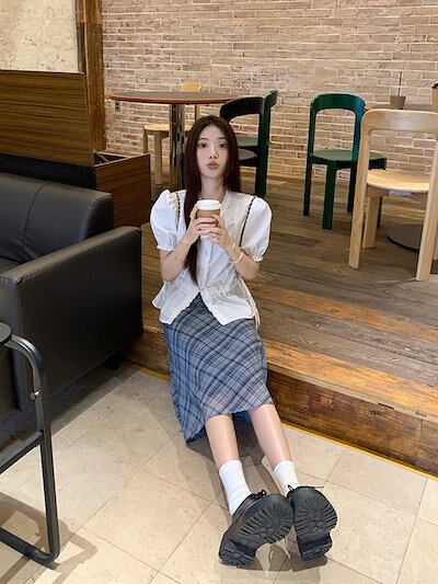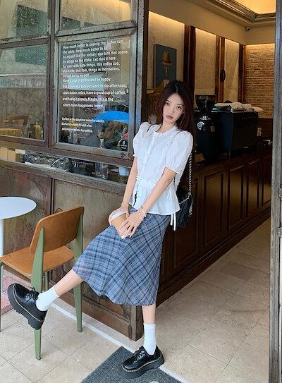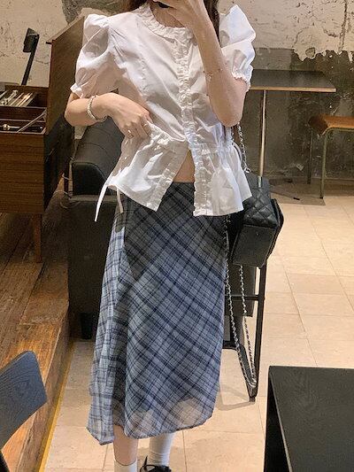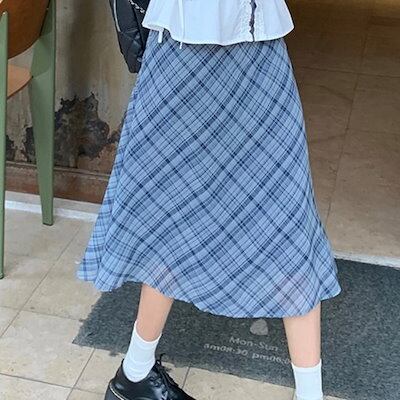 2024 春夏スカート 膝丈 Aライン レトロ チェック柄 ハイウエスト 美脚効果 脚長効果 細見え 夏 青 ブルー 韓国ファッション レディース かわいい おしゃれ きれいめ 大人っぽい カジュアル