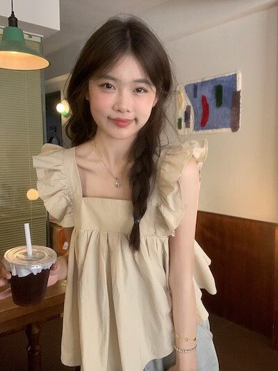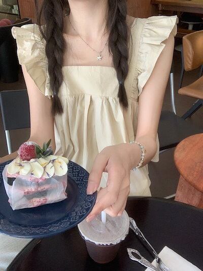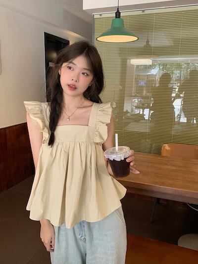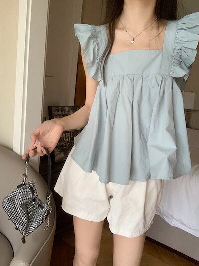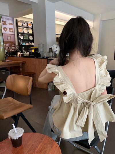 2024春夏トップス シャツ スクエアネック バック バックオープン フレア 夏 白 水色 かわいい ガーリー キュート おしゃれ 韓国ファッション レディース お出かけ