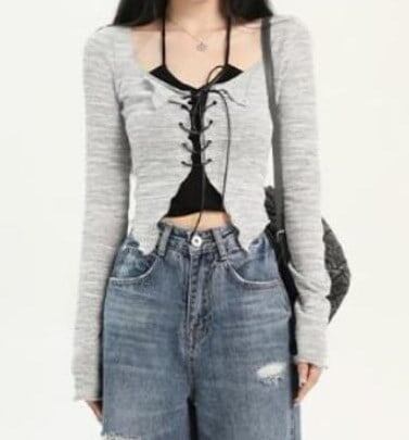 嬉しい二点セット! レースアップカーディガン&キャミソール 韓国ストリート 無彩色ルック 韓国カジュアル