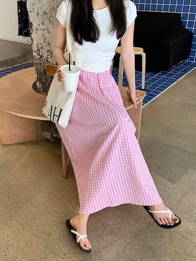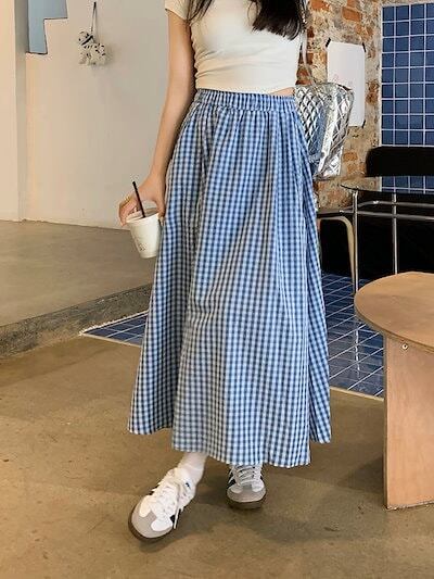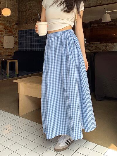 2024 春夏スカート ロング丈 フレア Aライン ギンガムチェック ウエストゴム ハイウエスト 脚長効果 美脚効果 細見え 夏 青 黒 カジュアル おしゃれ かわいい 韓国ファッション レディース
