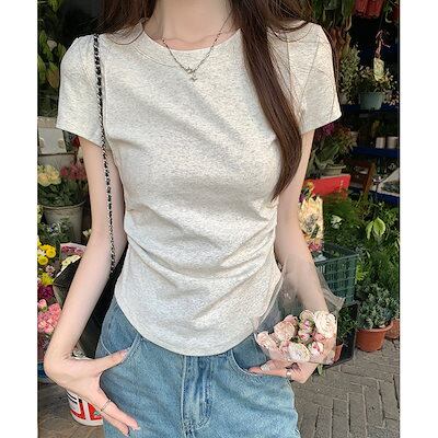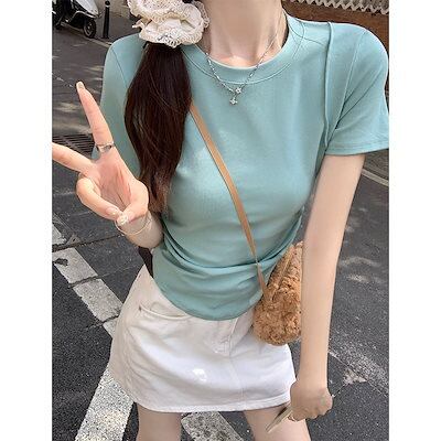 2024 春夏 甘い トップス Tシャツ ラウンドネック 3色展開丈 休日 ファッション スリムフィット丈短め ショート へそ出し 休日 おしゃれ T