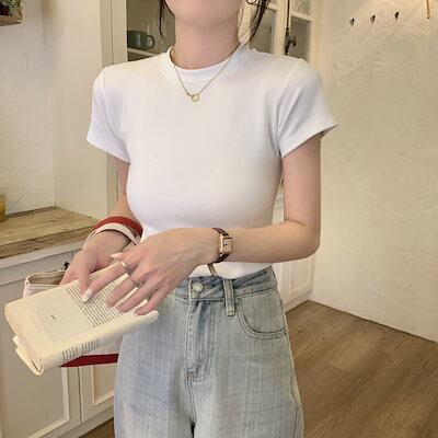 2024 春夏 甘い トップス Tシャツ ラウンドネック 3色展開丈 休日 ファッション スリムフィット丈短め ショート へそ出し 休日 おしゃれ T★1