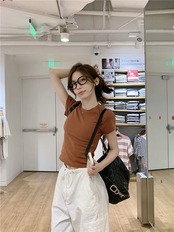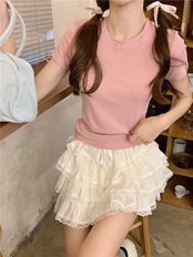 2024 春夏 甘い トップス Tシャツ ラウンドネック 7色展開丈 休日 ファッション スリムフィット丈短め ショート へそ出し 休日 おしゃれレディース T
