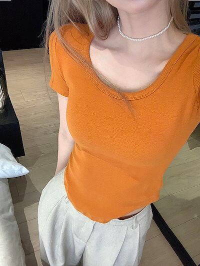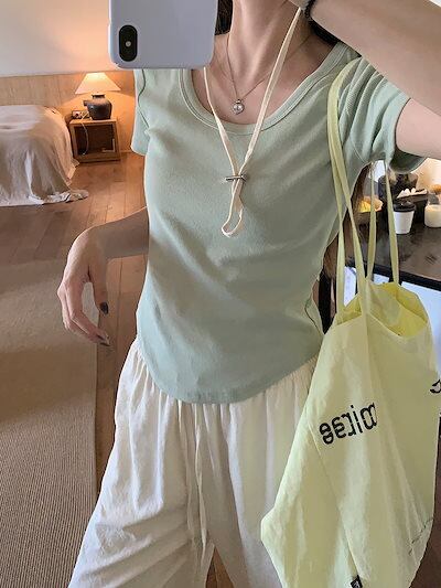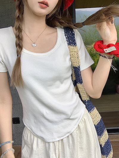 2024 春夏 甘い トップス Tシャツ ラウンドネック 11色展開丈 休日 ファッション スリムフィット丈短め ショート へそ出し 休日 おしゃれ T