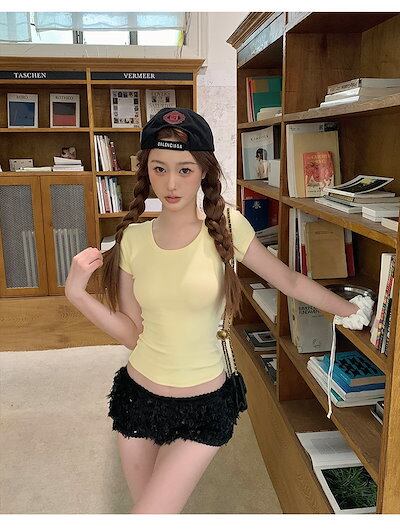 2024 春夏 トップス Tシャツ ラウンドネック 5色展開丈 休日 韓国 ファッション スリムフィット丈短め ショート へそ出し 休日 おしゃれ T★★1