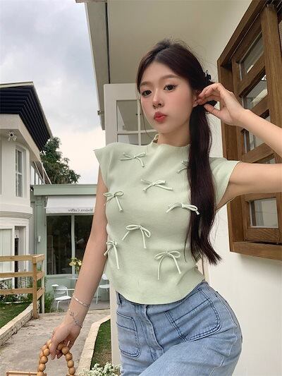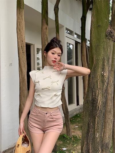 2024 春夏 甘い トップス Tシャツ ラウンドネック 2色展開丈 休日 ファッション スリムフィット丈短め ショート へそ出し 休日 おしゃれ T★4