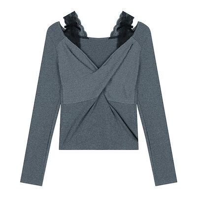 2024春夏 フェイクツーピース トップス レイヤード風 tシャツ 重ね着風 カットソー 長袖 インナー ショート タイト フィット T カジュアル きれいめ フェミニンフレンチモックネック