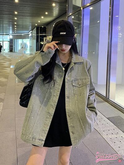 2024春夏アウター ジージャン デニム生地 ジャケット 丈長め 襟 スタンダードカラー ボタン キラキラ レトロ ヴィンテージ感 春 ライトブルー 水色 韓国ファッション レディース おしゃれ お出