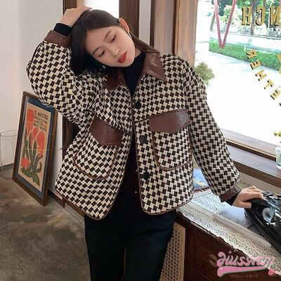 2024春夏異素材MIX 格子柄 ジャケット 韓国風 ショート丈 アウター レディース ツイード風 ジャケット PUレザー チェック柄 コート オシャレ 秋 冬 羽織り レトロ 着やせカ ジュアル 大