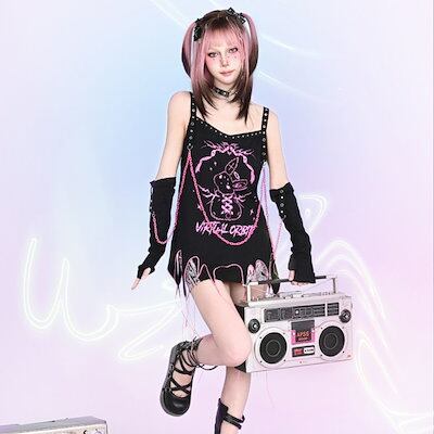 サブカルチャー ダーク ミレニアムY2K スウィート プリント ブラックパウダー スリーブ サスペンダー ベスト 2024年夏 アウターTシャツ