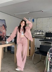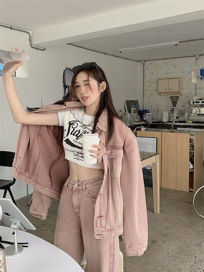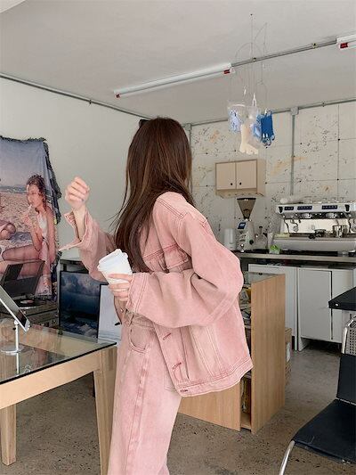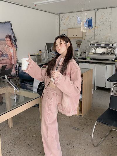 デニムセットアップレディース韓国ピンクデニムオーバーサイズワイドパンツデニムジャケット上下セットストレートアウターGジャン羽織り学生上下セットカジュアル韓国っぽY2k