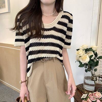 Tシャツカットソー Tシャツ 夏 アイスシルク tシャツ 半袖 レディース ボーダー ニット Tシャツ ゆったり着痩せ 半袖 ワイシャツ