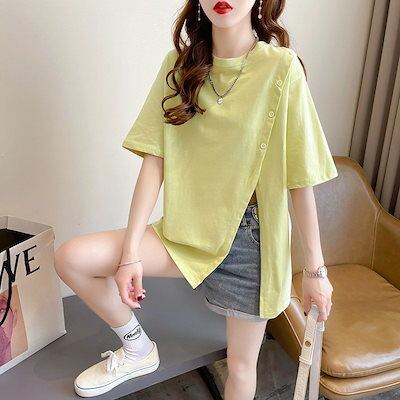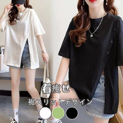 Tシャツカットソー 設計感 半袖 tシャツ レディース 夏 着痩せ 百掛けトップス 韓国ファッション 裾スリットデザイン Tシャツ 日系 シンプル ティーシャツ