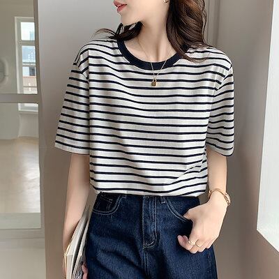 Tシャツカットソー 夏 ストライプ tシャツ レディース 百掛け 半袖 トップス 怠惰な風 カジュアル ゆったり シャツ 韓国ファッション 快適 Tシャツ /ブラウス