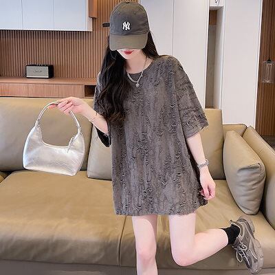 Tシャツカットソー 透かし彫り新作 夏 ??感 tシャツ 半袖 レディース 韓国ファッション 穴をあけ 大きいサイズ ロングTシャツ 体型カバー?半袖 トップス
