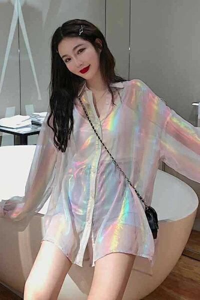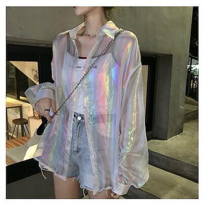 長袖ブラウス韓国ファッショシースルーシャツ長袖韓国薄手派手メタリックトップス上着 ゆったりフ レディース
