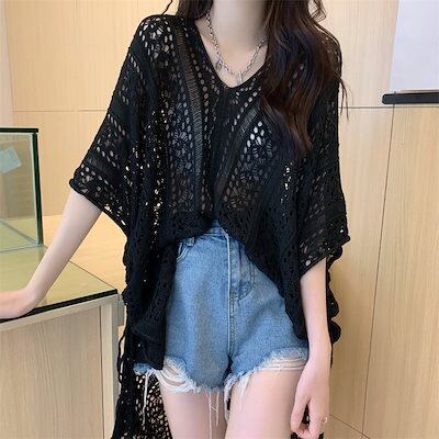 新作 夏 レディース 中空レースアップニットトップス 中空Vネックニットセーター 女性 夏 デザイン ゆったり ダラダラ 薄手 アウター トップス プルオーバー パーカー ドルマン アミアミ
