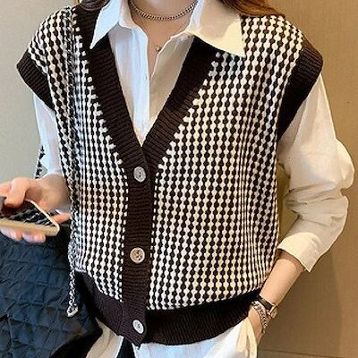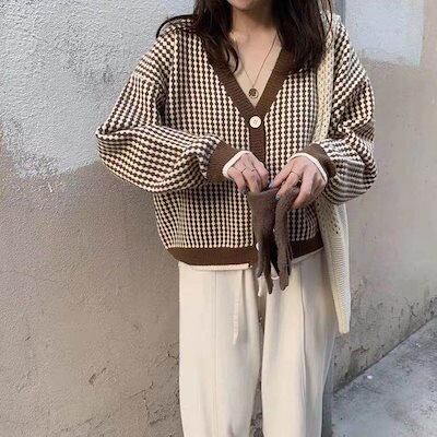 ジャケット 秋 韓国 ニット カーディガン セーター チェック コントラストカラー Vネック ゆったり トップス 百掛け カジュアル韓国ファッション