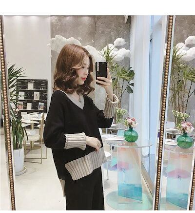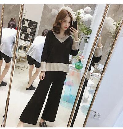 秋装2点セット2022新モデル気品ニット上着ワイドパンツ+ニット長袖上着