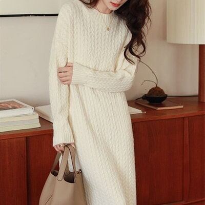 秋冬 ニットワンピース フィッシュテールスカートワンピース ツイストニットワンピース 着痩せワンピース冬のワンピース