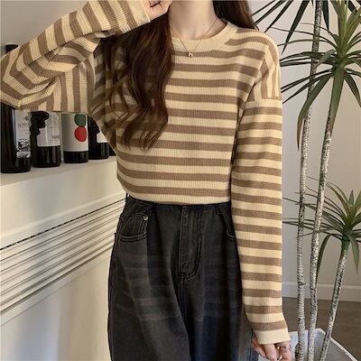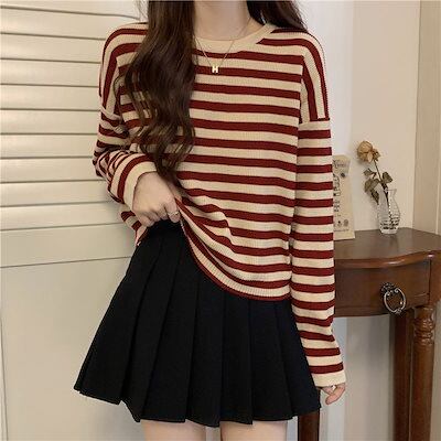 冬秋 ボーダー 丸ネック アンダーウェア トップス ゆったり ブラウス 長袖tシャツ レディース スウエット 流行り