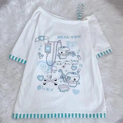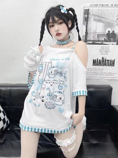 使える!シフォンブラウス Tシャツ 夏 新作 日系サブカル し 肩出し半袖 ロングTシャツ トップス