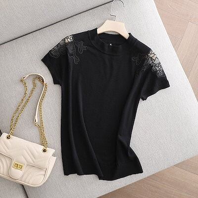 人气新作 Tシャツカットソー OL 通勤夏服 薄い メッシュ ニット アイスシルク 半袖 トップス大人 半袖Tシャツ トッ