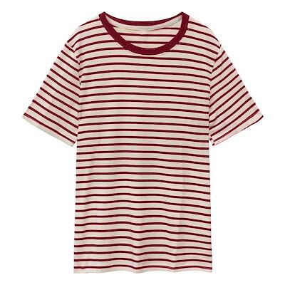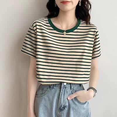 Tシャツ トップス レトロなインパクトカラーのストライプ半袖夏の新作パッチワーククルーネック レディース 韓国