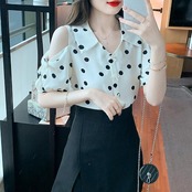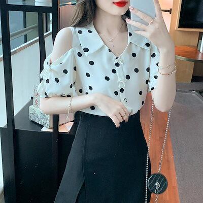 今っぽシアーシャツ レディース トップス 2024年春夏新作フレンチムードドールネック半袖肩出しドットシフォンカジュアル 韓国ファッション
