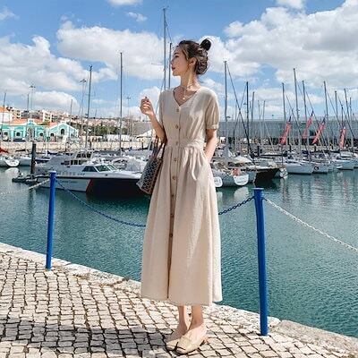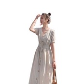 ワンピース レディース フランスシャツワンピース夏2024新型桔梗スカート膝上気質ウエストVネックロングスカート ドレス 韓国ファッション