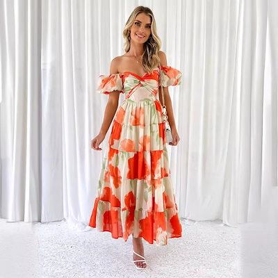 ワンピース レディース 2024春夏新作気品修身プリントバルーンスリーブ高級ワンピース ドレス 韓国ファッション
