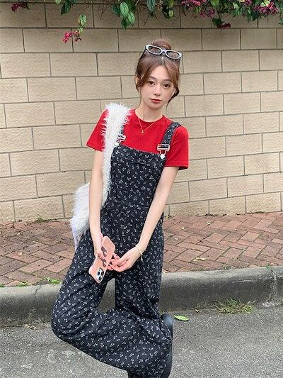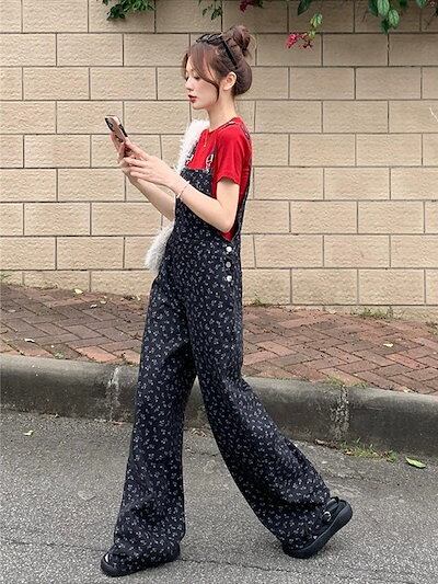 【3日以内出荷】コーデ完成!サロペット 夏の花柄デニムバックレスパンツ女性黒ゆったりストレートワイドパンツ 韓国ファッション