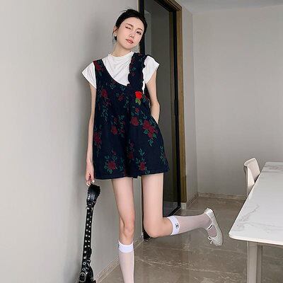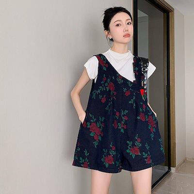 コーデ完成!サロペット プリントデニムストラップパンツ女性夏2024新しいワイドレッグショートパンツ 韓国ファッション